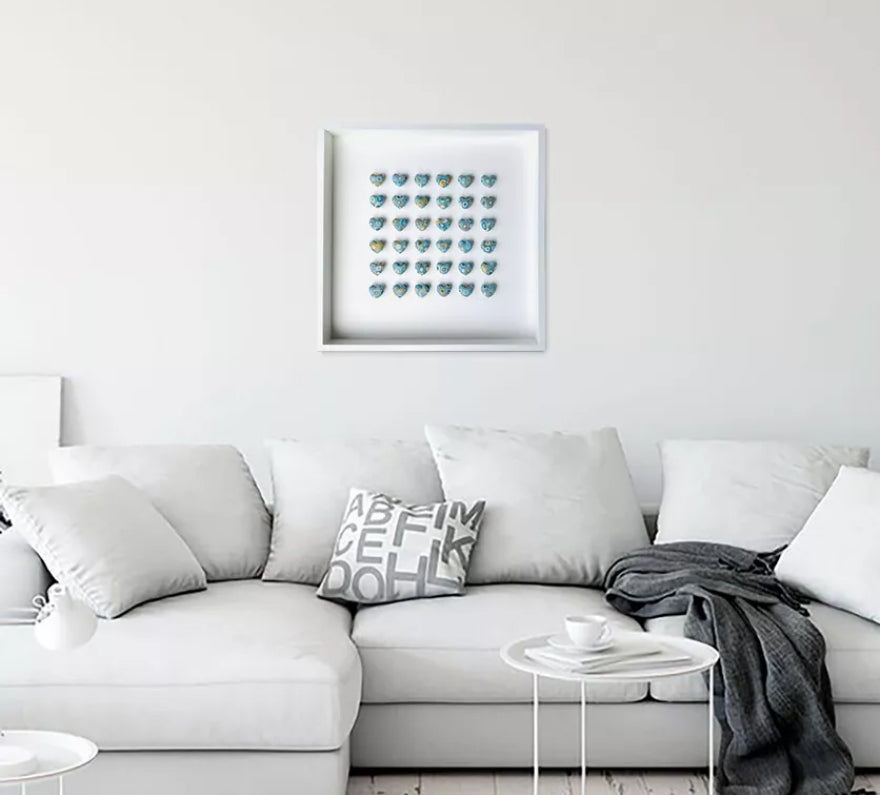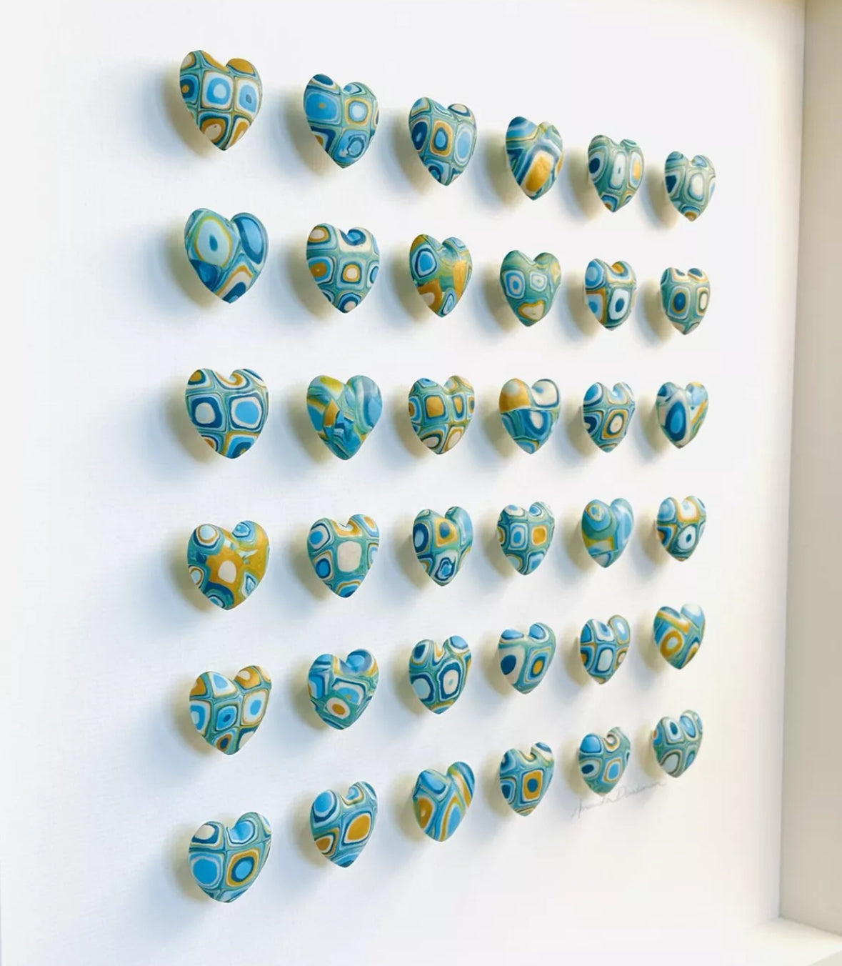 The sheets were then pressed into heart moulds to form the shapes, and once fired they were attached to tiny foam board plinths and mounted on a white card backing.